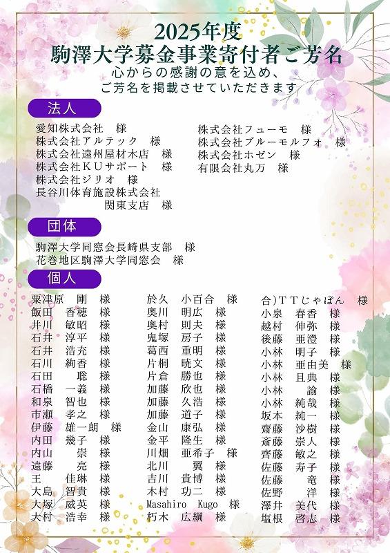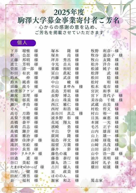 ①2023年4月1日以降、駒澤大学募金事業にご支援いただいた方(匿名希望者除く)を掲載しています