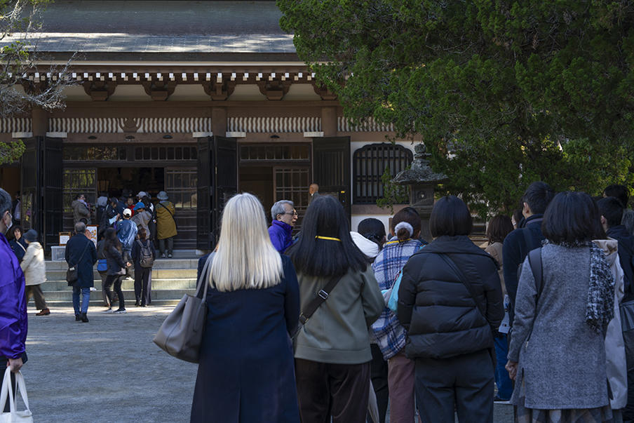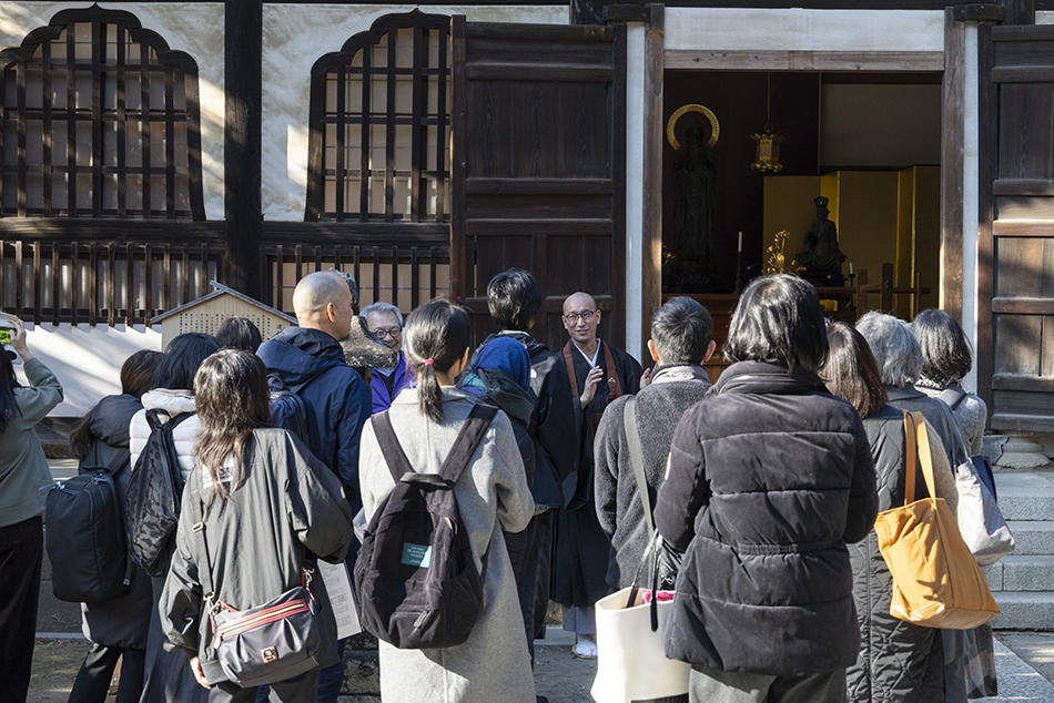 当日は秋晴れに恵まれ、ちょうど見ごろを迎えた美しい紅葉のもと、小川隆館長が山門など山内の紹介を行いながら、会場となる信徒会館に向かいました。夏目漱石『門』の作品名は、この山門に由来します。