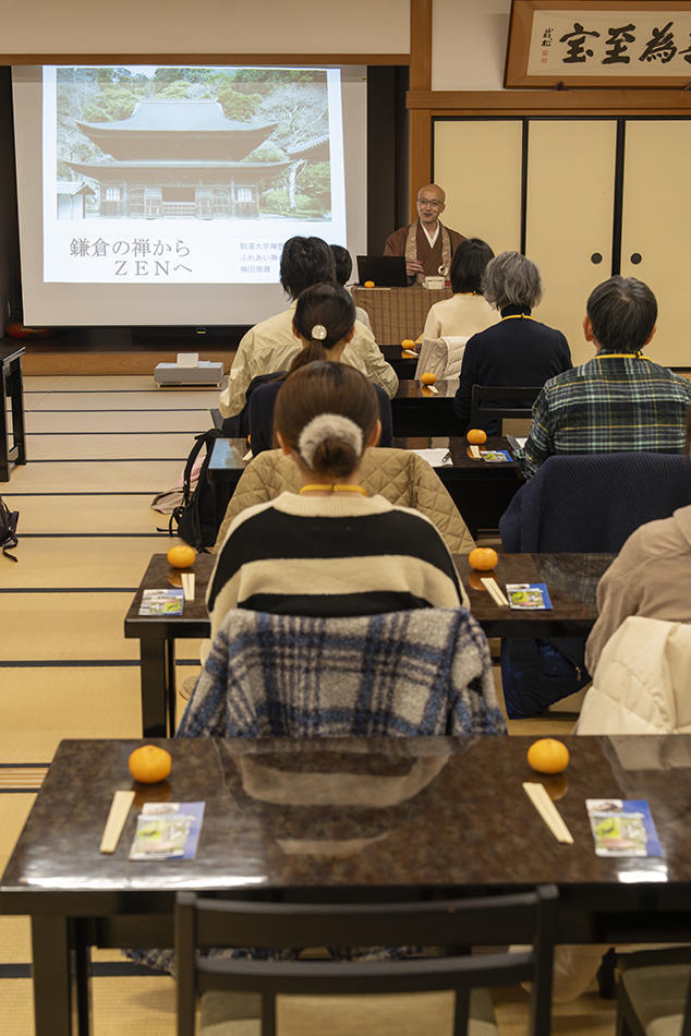 10時から「鎌倉の禅からZENへ」をテーマに円覚寺管長横田南嶺老師からお話を頂戴しました。創建当時の円覚寺の歴史や、時を明治に移し世界にZENが広まった経緯を話される横田老師の語り口は、目の前にその光景が広がる臨場感があり、参加者も熱心にメモを取っていらっしゃいました。その後、横田老師の丁寧なご指導のもとイス坐禅の実践が行われました。特に姿勢について、画像や割りばしなどを用いてわかりやすく教えていただきました。日常生活でも意識できるポイントを知ることができ、大変貴重な時間となりました。