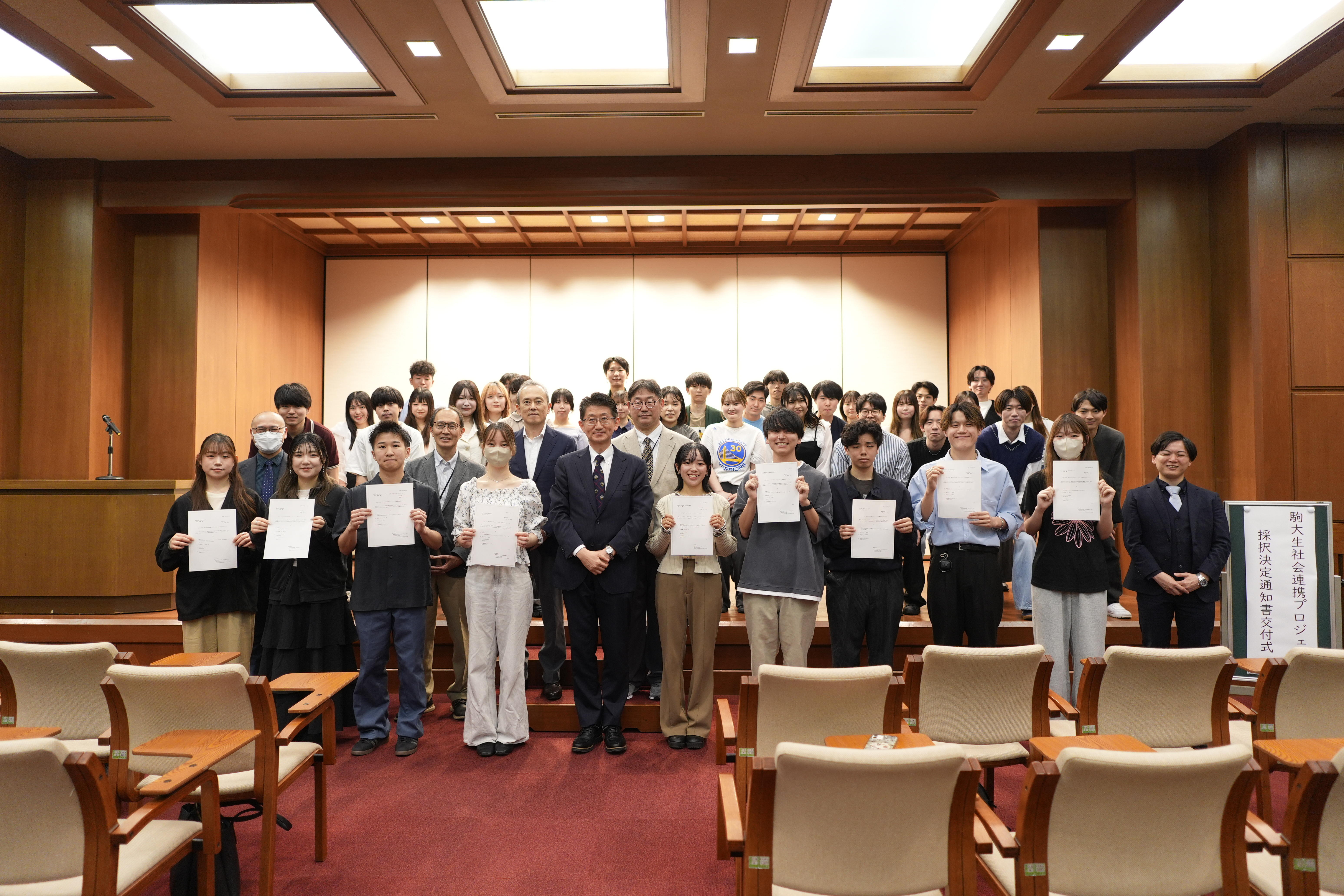 令和7年6月2日(月)、駒沢キャンパス中央講堂において、令和7年度「駒大生社会連携プロジェクト」採択決定通知書交付式が行われました。各採択プロジェクトには、村松哲文学長から採択決定通知書が手渡されるとともに、激励のメッセージが送られました。